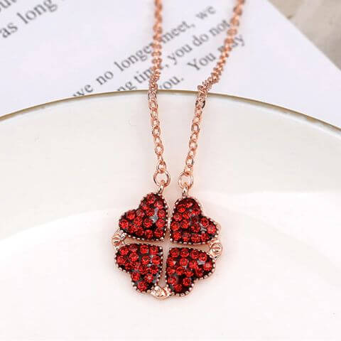 • Το κολιέ αλλάζει εύκολα σχήμα και από τετράφυλλο τριφύλλι μετατρέπεται σε σειρά από καρδιές, ενώ κάθε πλευρά έχει και διαφορετικό χρώμα: η μία πλευρά είναι μπλε και η άλλη κόκκινη!