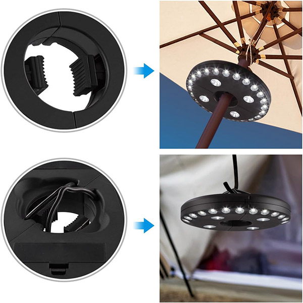Σε αντίθεση με τα συνηθισμένα φώτα ομπρέλας, το BRELLAGLO λειτουργεί όπου το χρειάζεστε. Στερεώστε το σε ομπρέλα για φωτισμό βεράντας ή χρησιμοποιήστε τους ενσωματωμένους γάντζους για να το κρεμάσετε—ιδανικό για κάμπινγκ και υπαίθριες περιπέτειες.
