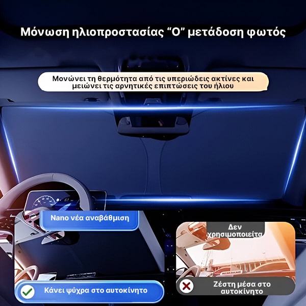 Εξασφαλίστε ότι το εσωτερικό του αυτοκινήτου σας παραμένει πιο δροσερό, προστατεύοντας το ταμπλό, τα καθίσματα και το τιμόνι από τις καυτές ακτίνες του ήλιου.