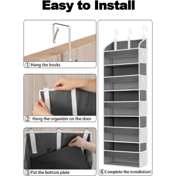 Εξοπλισμένος με 3 ρυθμιζόμενα μεταλλικά γάντζους, αυτός ο οργανωτής ταιριάζει εύκολα σε πόρτες μέχρι 4 εκατοστά πάχος.